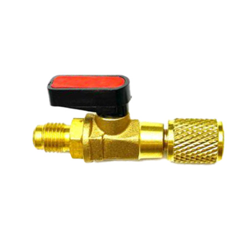 O acionador interno atua como um pino que abre a válvula ao acoplar o adaptador, enquanto o registro permite interromper ou liberar o fluxo de gás ou vácuo conforme necessário. É ideal para medições, carga de fluido refrigerante, vácuo e testes de pressão.