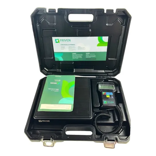 A Balança Digital CE 100 da Friven é uma balança eletrônica digital desenvolvida para medir com precisão a carga de fluido refrigerante em sistemas de ar-condicionado, refrigeração comercial e automotiva. Com capacidade de até 100 kg e resolução de ±5 g, ela garante controle exato durante o processo de carga ou recuperação de gás.