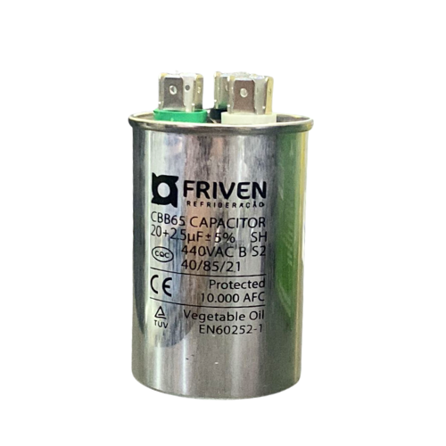 O Capacitor Duplo Friven CBB65 é utilizado em sistemas de climatização e refrigeração, atuando na partida e operação de motores monofásicos. Com capacidade de 20 + 2,5 microfarads (µF) e tensão de trabalho de 440V, o modelo duplo é ideal para equipamentos que exigem dois circuitos capacitores em um único corpo – geralmente compressor + ventilador.