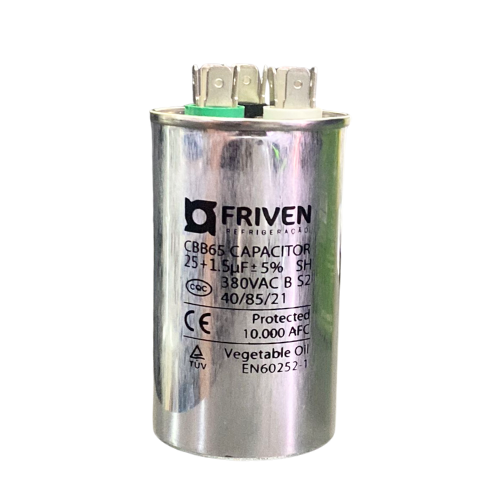 O Capacitor Duplo Friven CBB65 é utilizado em motores monofásicos de ar-condicionado split, atuando na partida e operação simultânea do compressor e do ventilador. Com capacidade de 25 + 1,5 microfarads (µF) e tensão nominal de 380V, este modelo é ideal para equipamentos que exigem dois circuitos capacitores em um único corpo.
