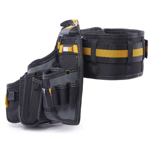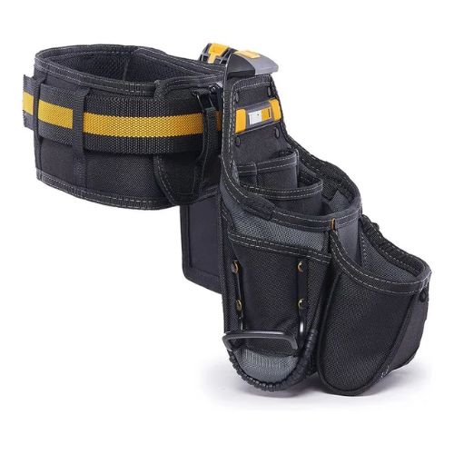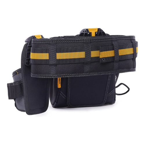 O conjunto inclui 2 bolsas resistentes e um cinto acolchoado com fivela reforçada, projetado para cinturas de 81 a 121 cm (32″ a 48″). Um suporte integrado permite que as bolsas fiquem em pé ao lado do usuário, seja no chão ou sobre uma bancada, mantendo as ferramentas sempre ao alcance.